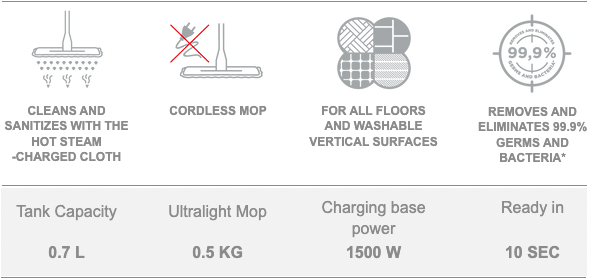 MOPPY 包括一个充电底座,用于对抹布进行蒸汽和消毒,以及一个轻巧灵活的阳极氧化铝无线拖把,可触及所有角落并绕过障碍物。热蒸汽抹布可以清洗和深层清洁所有类型的地板和垂直表面,无需使用清洁剂即可去除和消除99.9% 的细菌和病菌*。 MOPPY 是即时、实用和快速的,因为它结合了蒸汽的有效性和轻便灵活的拖把的简单性,消除了移动时烦人和笨重的水桶,并具有保持双手始终清洁和干爽的额外好处。